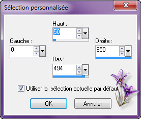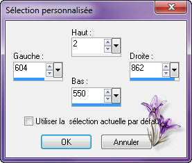 Mettre le calque sur mode Lumière douce 14. Image/ajouter une bordure de 2 couleur #ffffff blanc Calque/dupliquer Image /redimensionner à 90% tous les calques décochés Appliquer une ombre portée de 01/0/100 /40 noir 15. Calque/nouveau calque raster Outil sélection rectangle/sélection personnalisée