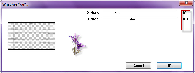 Remplir de la couleur blanche Sélection/modifier /contracter de 40 Supprimer Désélectionner tout Appliquer une ombre portée de 0/0/100/40 noir 10. Calque /dupliquer Modules externes/Simple /Blintz Calque/dupliquer/image/miroir/image renverser Fusionner avec le calque du dessous Baisser l’opacité à 75 Modules externes/Toadies/What Are You