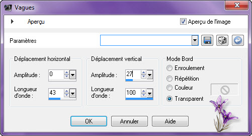 Calque/nouveau calque raster Remplir la bordure de la couleur #ffffff blanche Désélectionner tout Fusionner avec le calque du dessous Effet/effet distorsion/Vagues