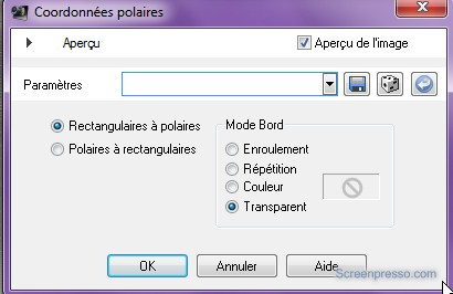 Fusionner les calques visibles 13. Calque /dupliquer Image/redimensionner à 90 % tous les calques décochés Effet/effet distorsion/Coordonnées polaires