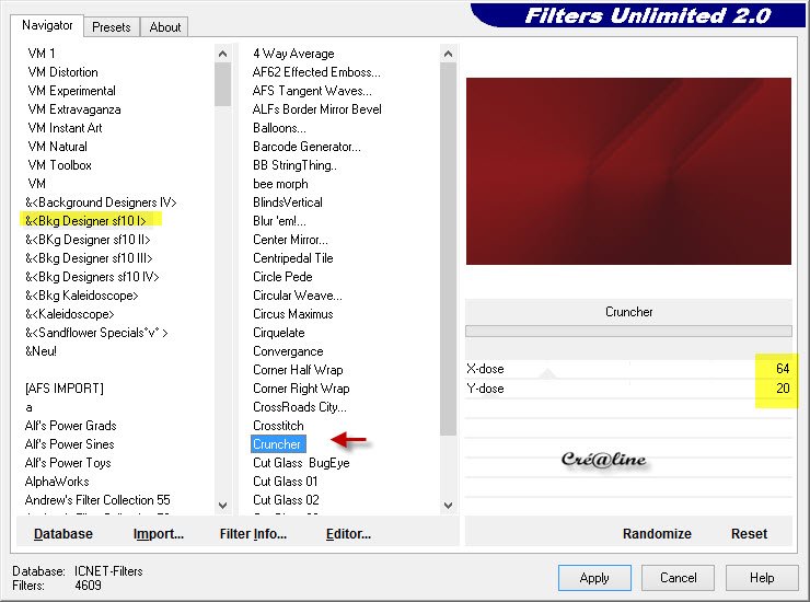 1. Ouvrir votre calque Alpha sélection dans votre psp /Maj D pour le dupliquer Ou Fenêtre /dupliquer Nous travaillons sur la copie Versez votre dégradé dans votre calque Effet /modules externes/Unlimited/&<Bkg Designer sf10 I>/Cruncher