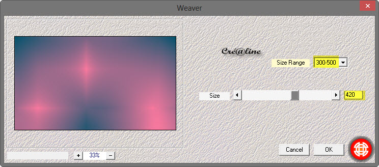 Dans votre palette style et texture placer la couleur 1 en avant plan Remplir votre sélection de votre dégradé du départ Opacité de votre pot de peinture sur 100 Désélectionner tout Effet/modules externes/Medhy/weaver