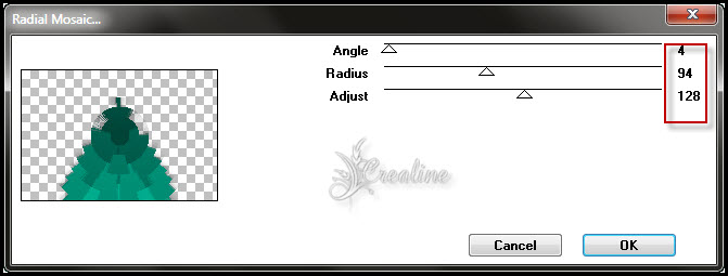Sélection/transformer en calque Désélectionner tout Appliquer une ombre portée de 0/0/50 /40 noir Effet/VM Toobox/Radial Mosaic