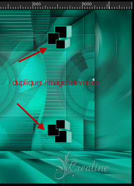 Sélection/transformer la sélection en calque Désélectionner tout Appliquer une ombre portée de 0/0/50/40 noir Calque /dupliquer Image/miroir Fusionner avec le calque du dessous Effet/distorsion/Miroir déformant