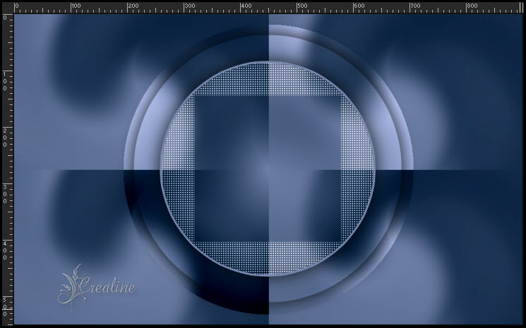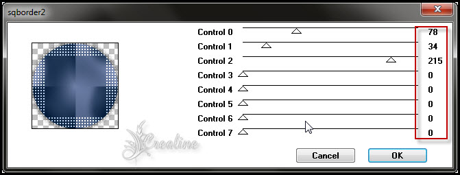 Sélection/transformé la sélection en calque Appliquer une ombre portée de 0/0/ 80/40 noir Nommer ce calque cercle 2 Sélection/modifier/contracter de 50 Sélection/transformer la sélection en calque Nommer ce calque cercle 3 Appliquer la même ombre portée que ci-dessus Effet/modules externes /AFs Import Sq Border 2