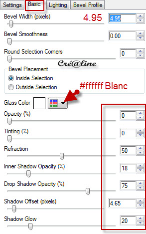 Remplir de la couleur 4 avant plan Sélection/modifier /contracter de 2 Remplir de la couleur 2 arrières plans Effet/modules externes/Eyes candy Impact 5 /Glass