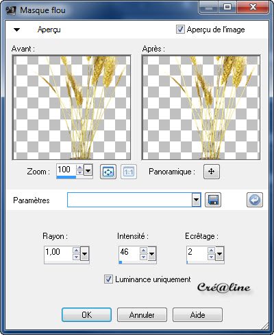 Remplir de la couleur 4 avant plan Sélection/modifier/contracter de 5 Supprimé au clavier Sélection/modifier/contracter de 10 Remplir de la couleur 4 av plan Effet/Eyes Candy Impact 5/Glass Mêmes paramètres que ci-dessus Désélectionner tout Appliquer une ombre portée de -4/3/50/5 noir 22. Activer votre tube vase_blé/édition copié Edition/collé comme nouveau calque Image redimensionner à 50% tous les calques décochés Réglage/netteté/masque de flou