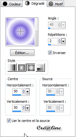 Couleur avant plan : #7f6cda Couleur arrière plan : # ffffff Préparé un dégradé Halo Angle 0/ répétition 2 inverser coché