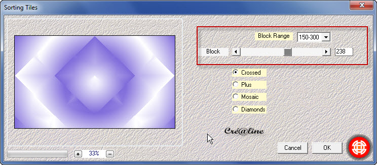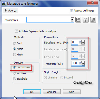 Remplir de votre couleur 2 arrières plans (blanc pour moi) Sélection/modifier /contracter de 10 Supprimer ou delet au clavier Désélectionner tout Calque /dupliquer Effet /effet image/mosaïque sans jointures