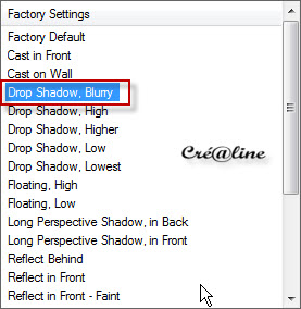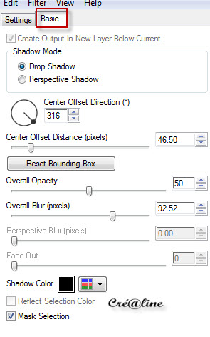 Désélectionner tout Édition /copié /édition /coller comme nouveau calque Image /redimensionner à 95 % /deux fois /tous les calques décochés Réglage/netteté/netteté Placer votre tube à droite comme modèle Effet/modules externes/Eyes Candy 5 Impact /Perspective Shadow Cliquer sur Basic et avec les paramètres ci dessous