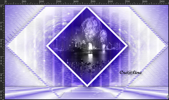 6. Positionnez en haut de pile sur la copie de raster 1 Sélection chargé à partir du canal alpha la sélection 2 à nouveau Sélection/modifier /contracter de 10 Supprimer ou delet au clavier Laisser la sélection active 7. Calque/ nouveau calque Activer votre tube feu d’artifice Faline23 Édition/copier /édition /coller dans la sélection Mettre ce calque en mode Lumière H ou autres Réglage/netteté/davantage de netteté Désélectionner tout Vous placez sur votre calque raster 1 nommez le cadre agencer /déplacer vers le haut deux fois Vous devez avoir ceci (ne tenez pas compte de la couleur de mon fond)