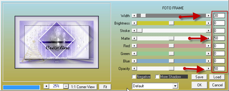 Fusionner les calques visibles 18. Image /ajouter des bordures de 2 pixels de couleur 1 avant plan 50 pixels de couleur 2 arrières plans 2 pixels de couleur 1 avant plan 5 pixels de couleur 2 arrières plans 2 pixels de couleur 1 avant plan Effet/modules externes /AAA Filtre /Foto Frame