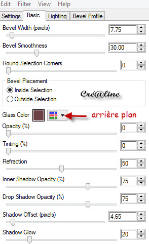 Remplir de votre couleur arrière plan (foncé) Désélectionner tout Effet/modules externes/Eyes Candy Impact 5 /Glass