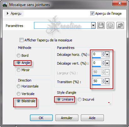 Passez ce calque en mode Assombrir Appliquer une ombre portée de 0/0/35/15 noir 10. Vous repositionnez sur votre fond (fusionné) Effet/effet image/mosaïque sans jointures