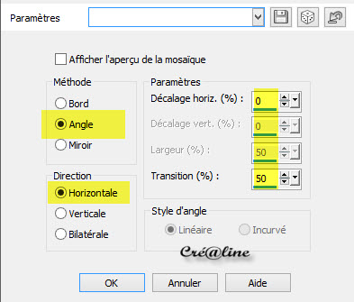 Appliquer une ombre portée de 10/10/50/5 noir Répéter en négatif -10/-10 /50/5 noir Baisser l’opacité du calque à 32 Calque /dupliquer Effet /effet image/Mosaïque sans jointures
