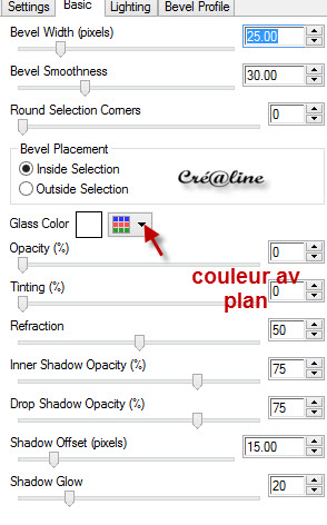 Remplir de la couleur avant plan Effet/modules externes/Eyes Candy Impact/Glass Avec les paramètres ci dessous