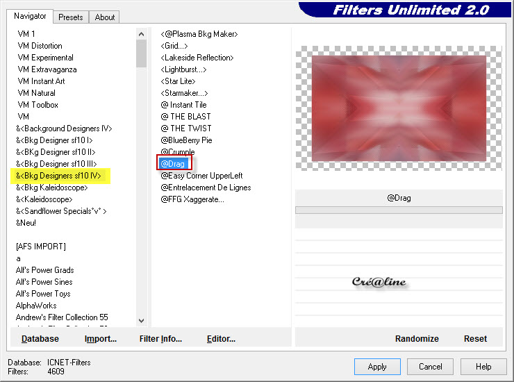 Calque /dupliquer Image/redimensionner à 85% tous les calques décochés Effet/modules externes/Unlimited/&<Bkg Designers sf10 IV>/Drag