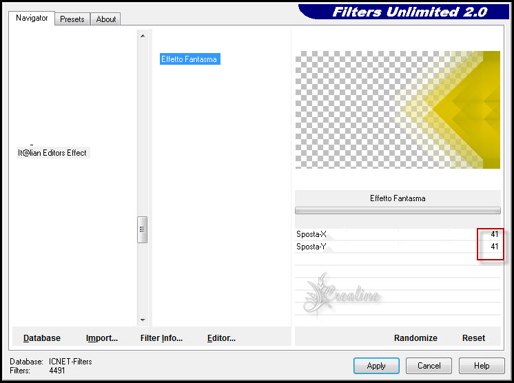 Sélection/transformer la sélection en calque Désélectionner tout Effet/modules externes/Unlimited/Italian Editor Effect/Effetto Fantasma
