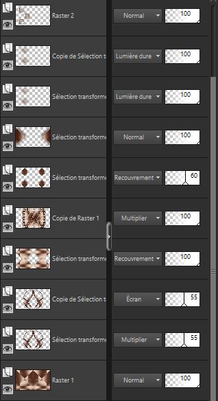 Calque /dupliquer Image /miroir Fusionner avec le calque du dessous Passez le calque en mode Multiplier Baisser l’opacité du calque à 55 Calque /dupliquer Passez en mode Ecran 10 Positionnez vous sur le haut de pile Calque/nouveau calque Sélection/charger à partir du canal alpha la sélection 6